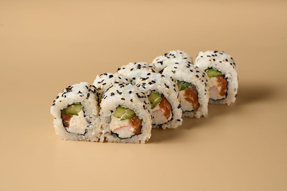 КБЖУ:347/11/6/62 Ингредиенты:рис, вода, уксус рисовый, сахар, соль, лимон, водоросли нори, сыр сливочный, огурец, крабовые палочки, лосось, кунжут Выход:180г
