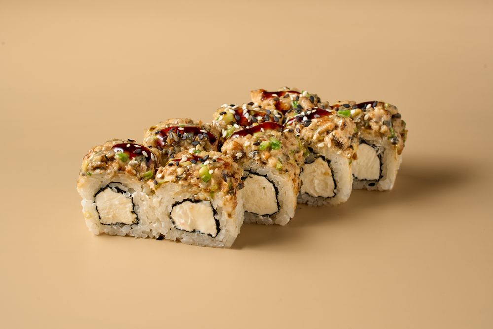 Ингредиенты:рис, вода, уксус рисовый, сахар, соль, лимон, водоросли нори, сыр сливочный, угорь, лук зеленый, авокадо, майонез, соус устричный, соус терияки, кунжут, имбирь маринованный, васаби, соевый соус