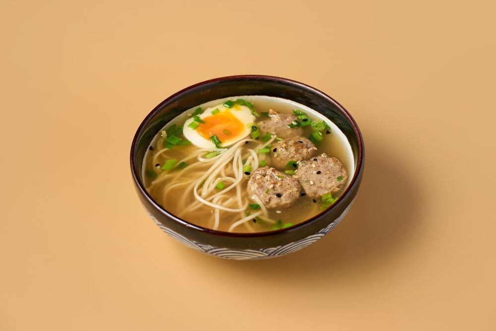 Бульон тайваньский, лапша пшеничная, фрикадельки из говядины, яйцо, кунжут, лук зеленый