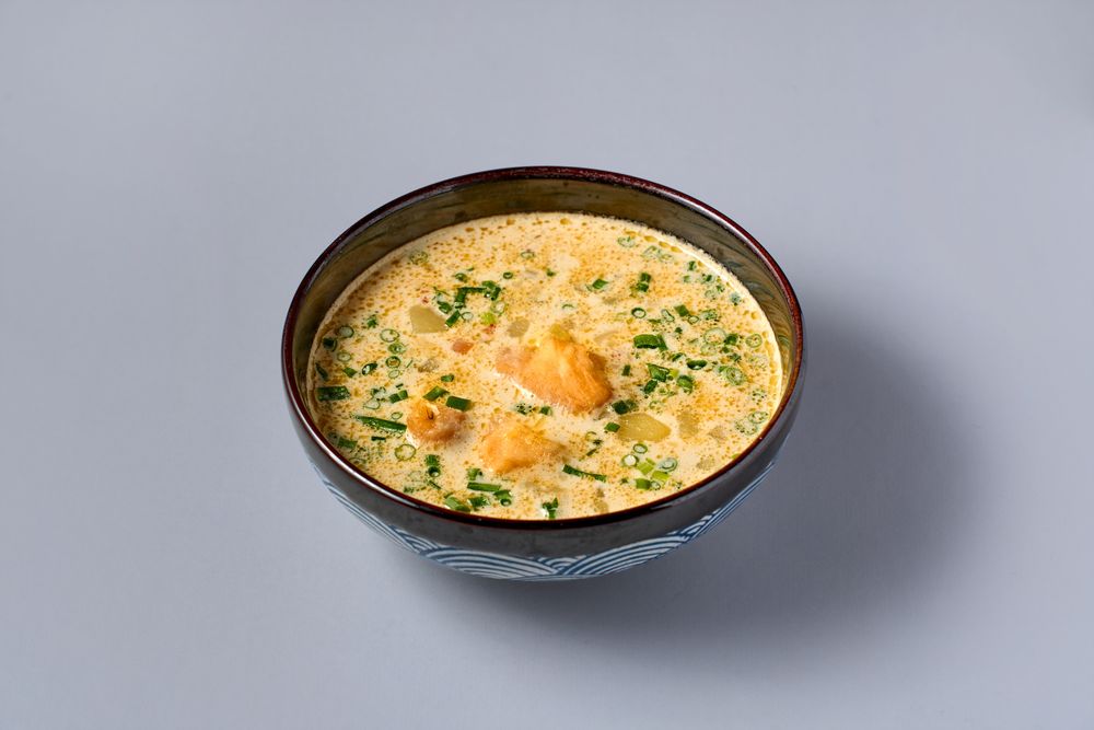 Ингредиенты:бульон (лук репчатый, перец болгарский, сельдерей, картофель, бульон куриный концентрированный сухой, хондаши, аджиномото, сыр плавленный, соус устричный, вода, сливки 22%), лосось, крахмал картофельный, лук зеленый