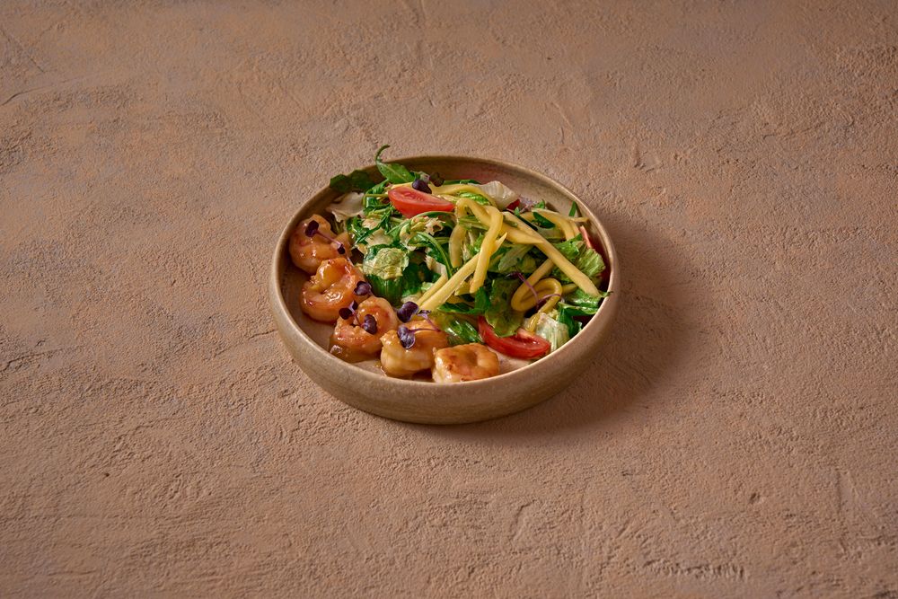 Ингредиенты:салат айсберг, салат Романо, рукола, манго, томаты черри, сок манго, уксус рисовый, уксус 9%, соевый концентрат, цедра апельсина, чеснок, имбирь, соль, сахар, крахмал кукурузный, креветки тигровые, микрозелень