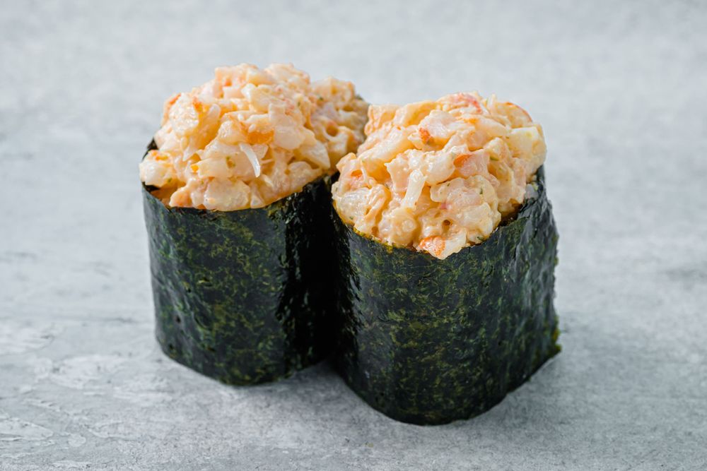 Ингредиенты:рис, вода, уксус рисовый, сахар, соль, лимон, креветки тигровые, водоросли нори, чеснок, лук красный, кинза, соус кимчи, паста табаджан, соль, майонез, перец чили красный, сахар