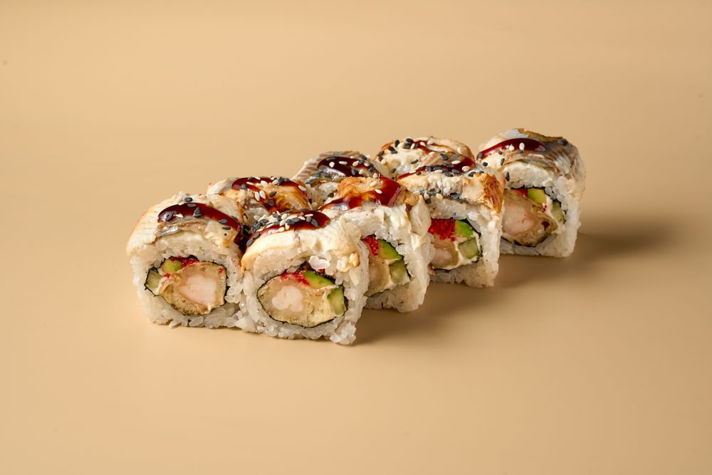 Ингредиенты:водоросли нори, огурец, икра летучей рыбы, майонез, авокадо, угорь, масло растительное, креветки тигровые, кляр темпура ,рис, вода, уксус рисовый, сахар, соль, лимон, соус терияки, кунжут