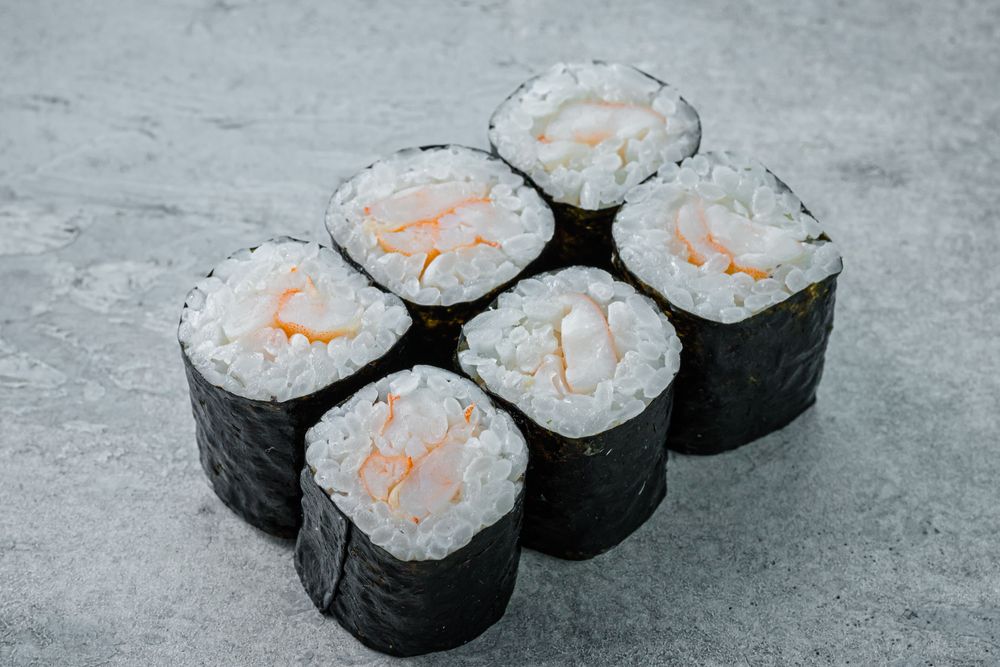 КБЖУ:206/8/1/42 Ингредиенты:рис, уксус, сахар, соль, лимон, водоросли нори, креветка тигровая Выход:150г