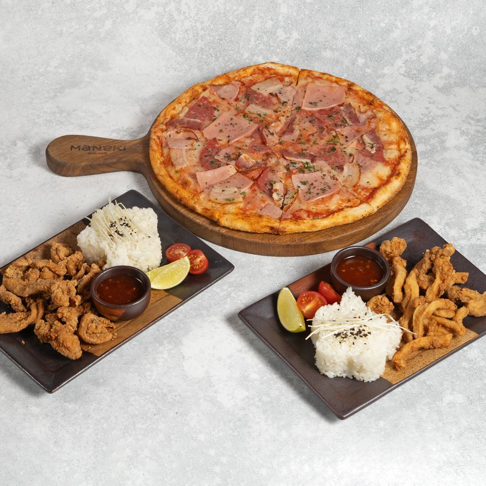 -Пицца Мясная (средняя): Ветчина, варено-копченый окорок, сырокопченый бекон, варено-копченая колбаса, моцарелла, соус из протертых томатов. Вес 670г. -Хрустящая курица с кисло-сладким чили соусом (2 порции): Филе куриного бедра, рис, черри, кисло-сладкий чили соус. Вес 570г.