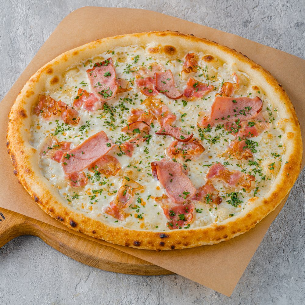 Сырокопченый бекон, варено-копченый окорок, моцарелла, чесночный соус