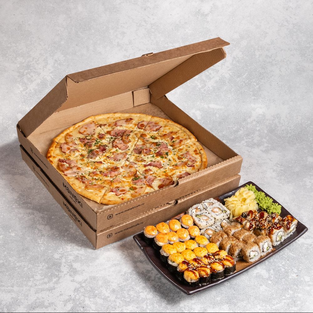 --Пицца Пепперони (большая): пепперони, сыр моцарелла, соус из протертых томатов, оливковое масло. Вес 530г. -Пицца Карбонара (большая): сырокопченый бекон, варено-копченый окорок, моцарелла, чесночный соус. Вес 650г. Запеченный ролл: - С копченой курице : копченая курица, огурец, соус для запекания. Вес 185г. - С сурими и тобико: сурими, сливочный сыр, соус для запекания с тобико. Вес 185г. - С окунем и соусом терияки: окунь, сливочный сыр, соус для запекания, соус терияки. Вес 185г. -Тоттори с тигровыми креветками: креветки в сухарях панко, авокадо, сливочный сыр. Вес 160г. -Филадельфия с угрем: угорь, авокадо, огурец, сливочный сыр, соус терияки. Вес 210г. -Бонито с сурими: сурими, огурец, сливочный сыр, стружка тунца. Вес 190г.