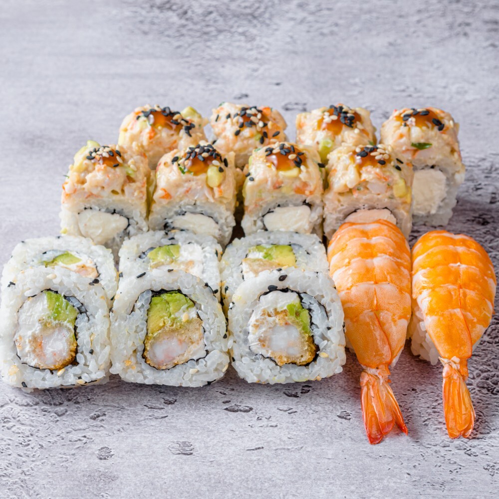 С тартаром из креветки; Тоттори с креветками; Суши с креветкой (16 шт).