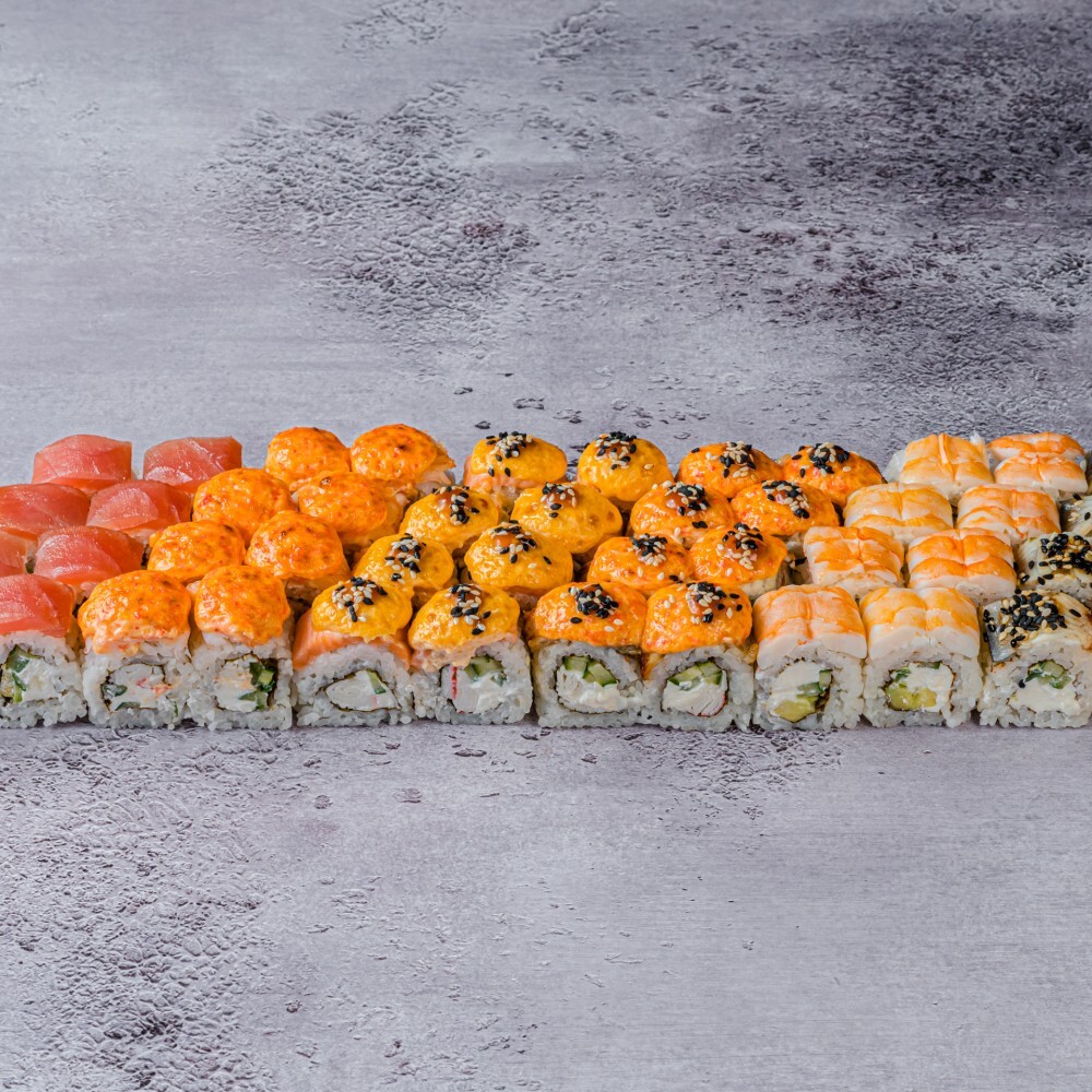 Филадельфия с креветкой; Филадельфия с угрем; Филадельфия с тунцом; Запеченная Филадельфия с угрем; Запеченный сливочный с креветками; Запеченный с лососем (48 шт).