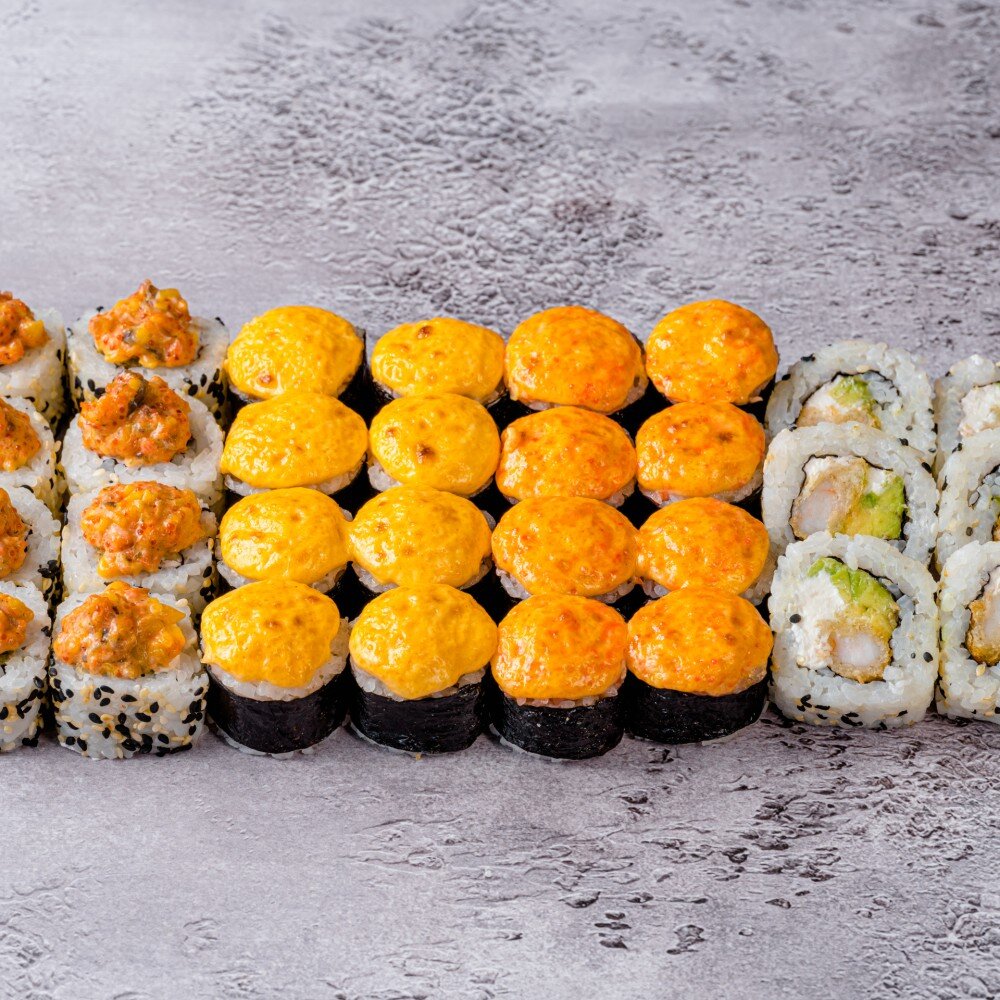 Запеченный с копченой курицей; Запеченный с сурими и тобико; Тоттори с креветой; Рисутеки (30 шт).