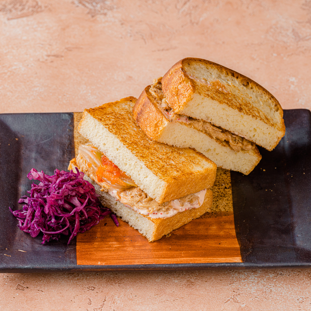 Хлеб "Хоккайдо", свинина, капуста кимчи, маринованая капуста, соус асуми