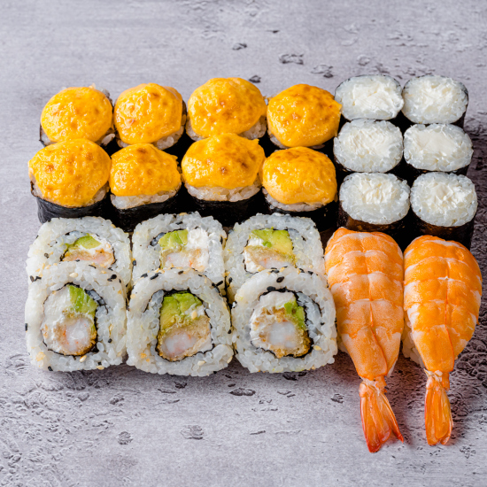 Креветки, кальмар в сухарях панко, апельсин, соусы: окиси, апельсиновый терияки