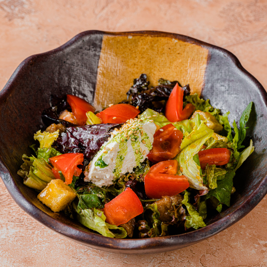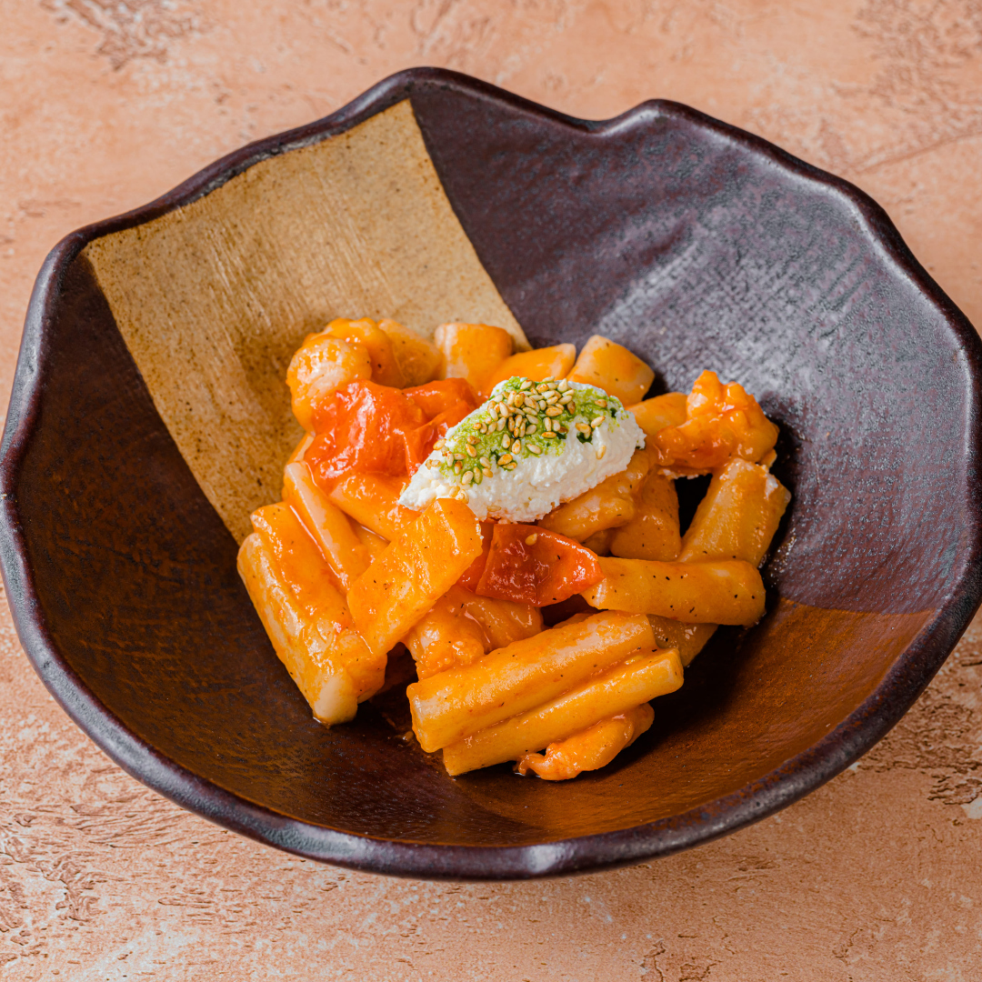 Креветки, ттокпокки, томатты, рикотта, соус из протертых томатов