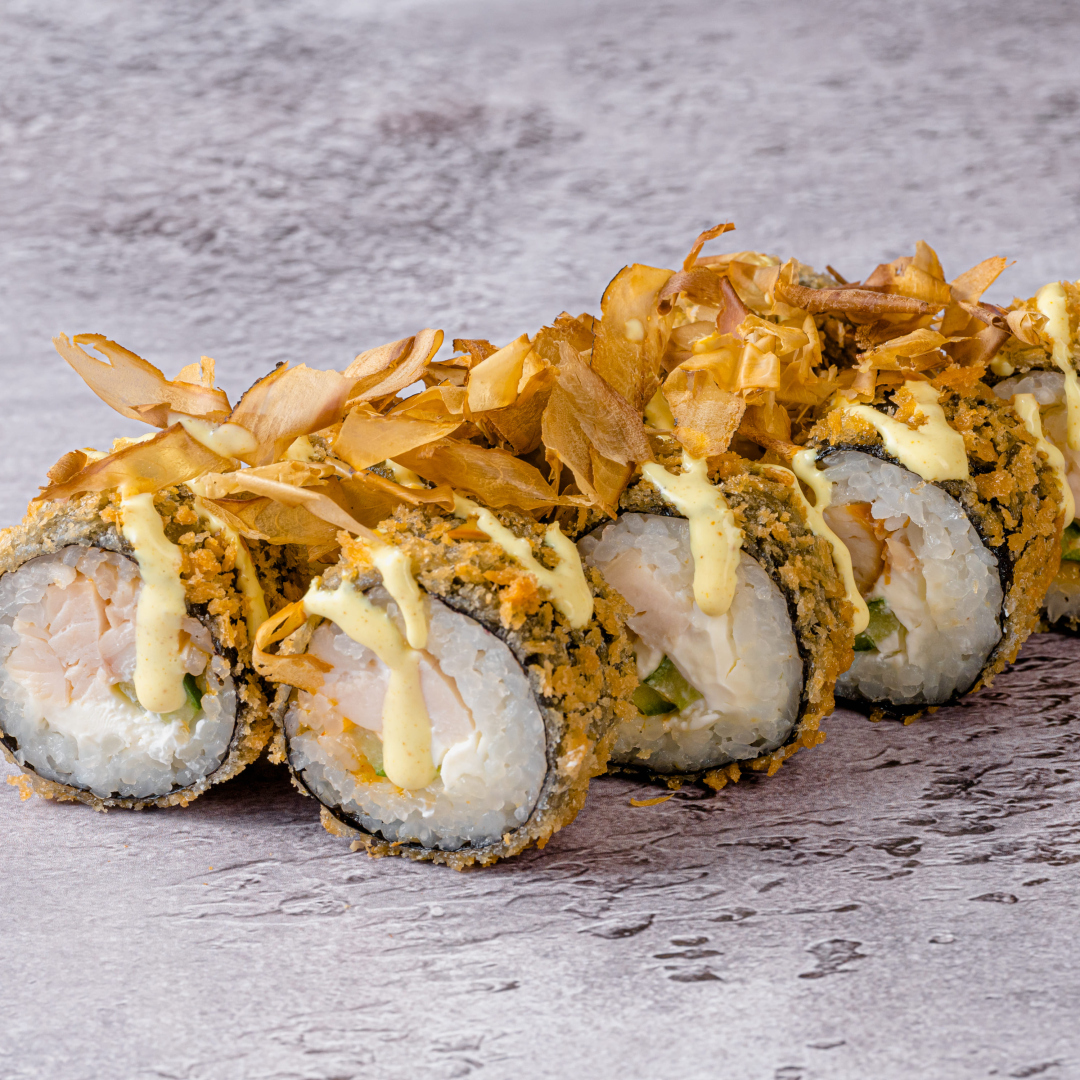 Копченая курица, огурец, сливочный сыр, сухари панко, стружка тунца, соусы: спайси, сливочный карри