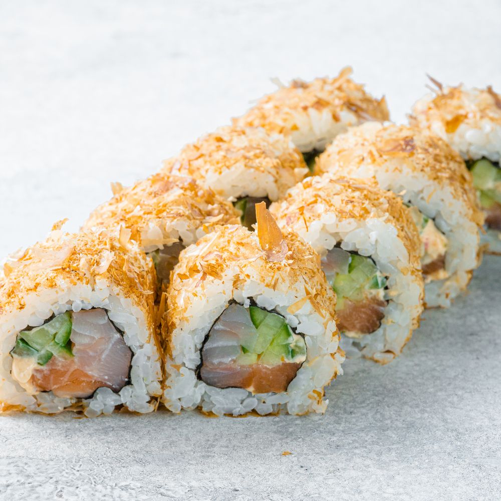 Лосось, окунь, огурец, стружка тунца, спайс соус