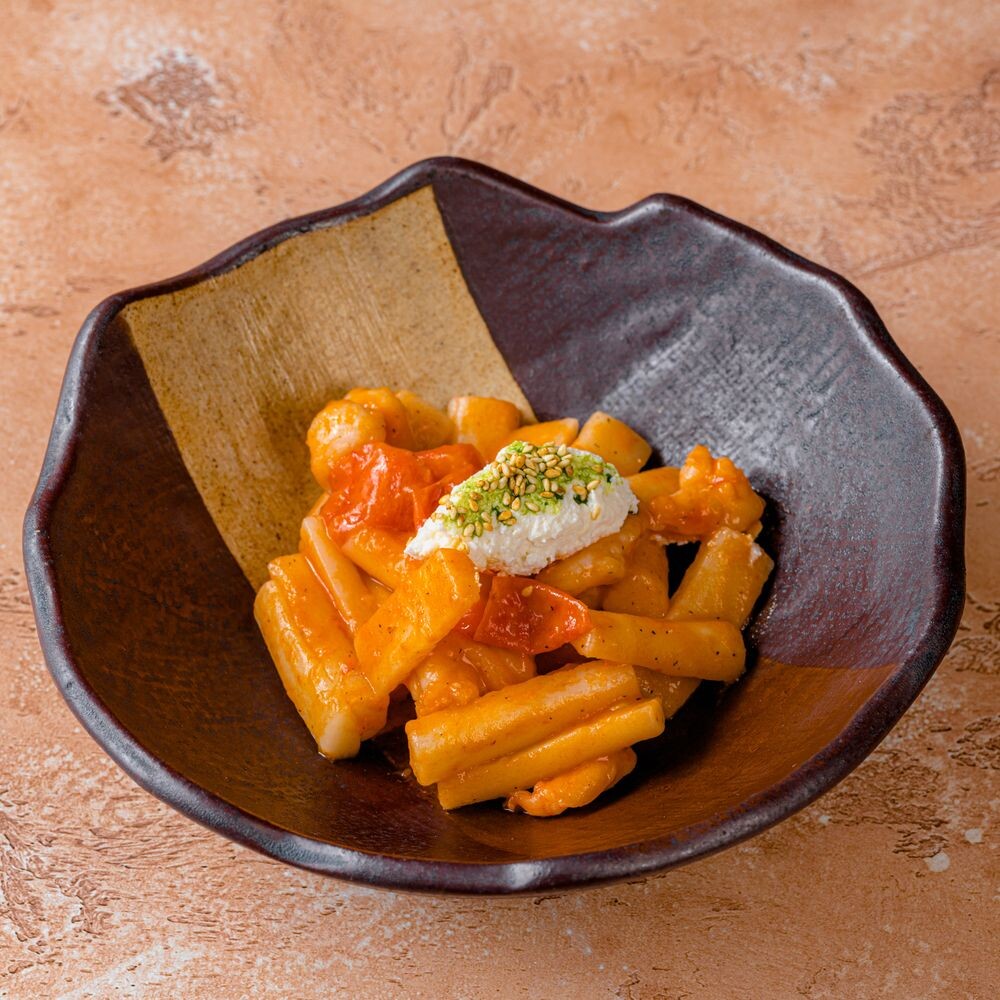 Креветки, ттокпокки, томаты, рикотта, соус из протертых томатов
