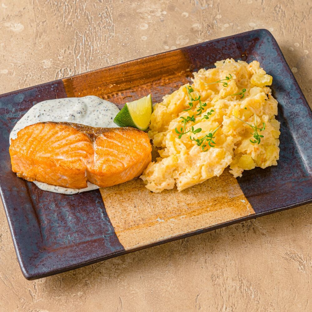 Филе лосося (жареное или паровое), толченый картофель, тобико, японский майонез, сливочно-трюфельный соус