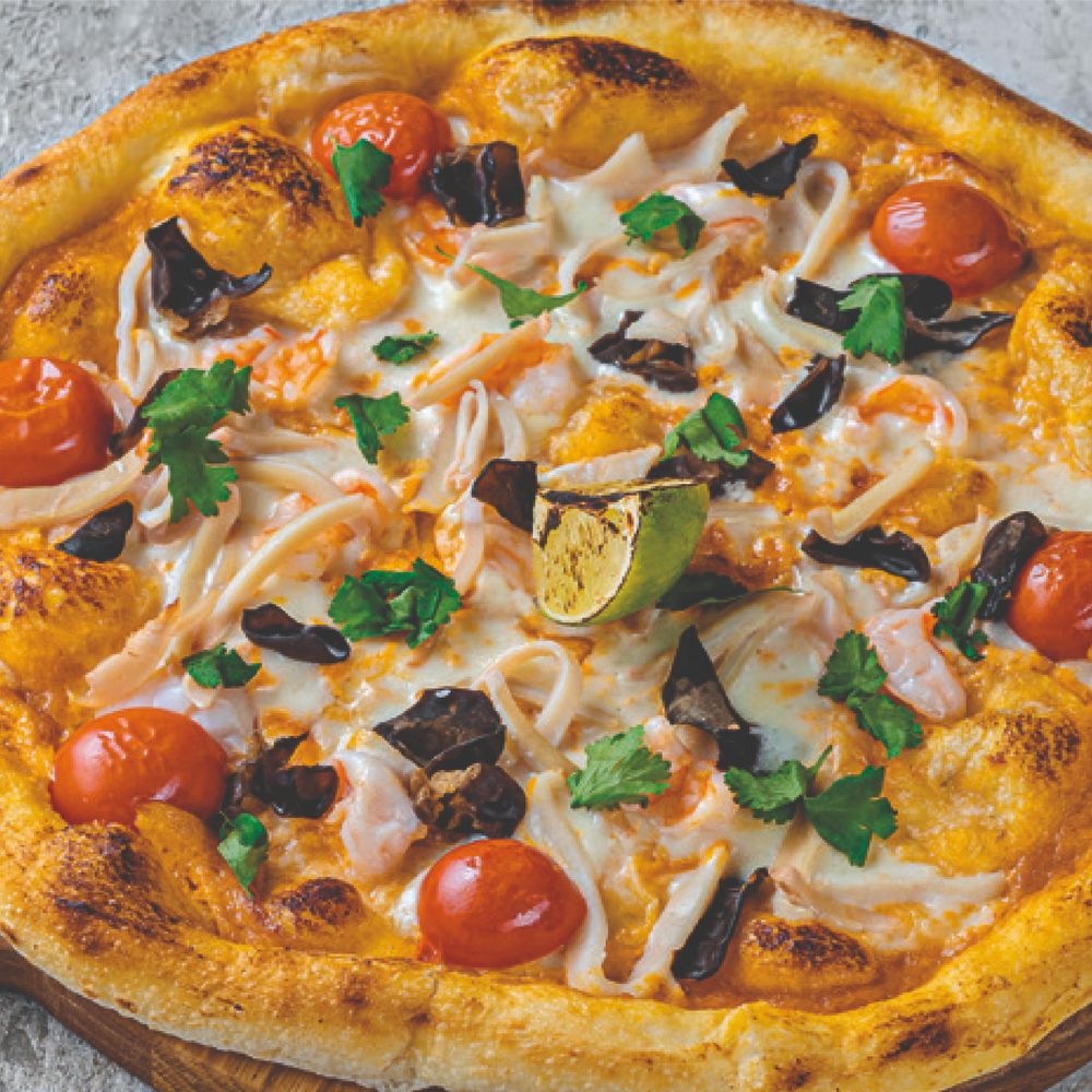 Креветки, кальмар, муэр, моцарелла, черри, кинза, соус том-ям
