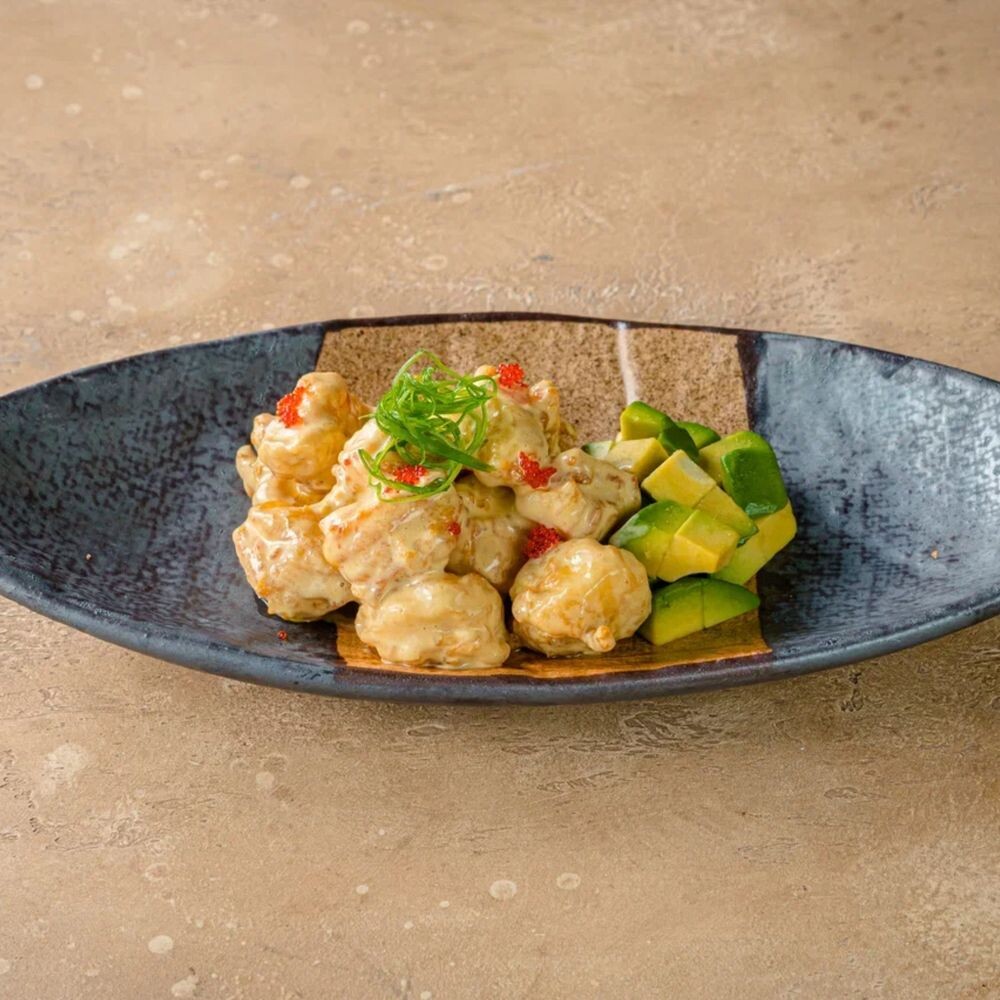 Креветки в темпуре, авокадо, тобико, соусы: сливочный карри, унаги, устричный