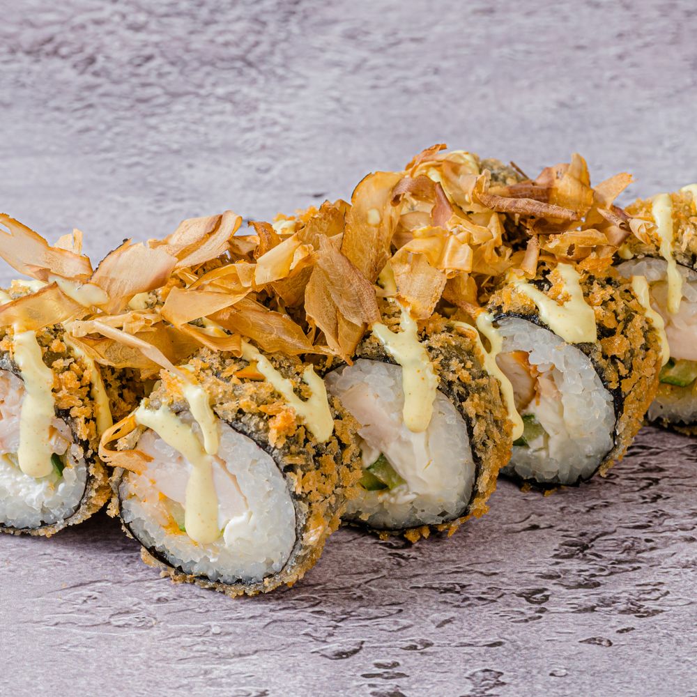 Копченая курица, огурец, сливочный сыр, сухари панко, стружка тунца, соусы: спайси, сливочный карри