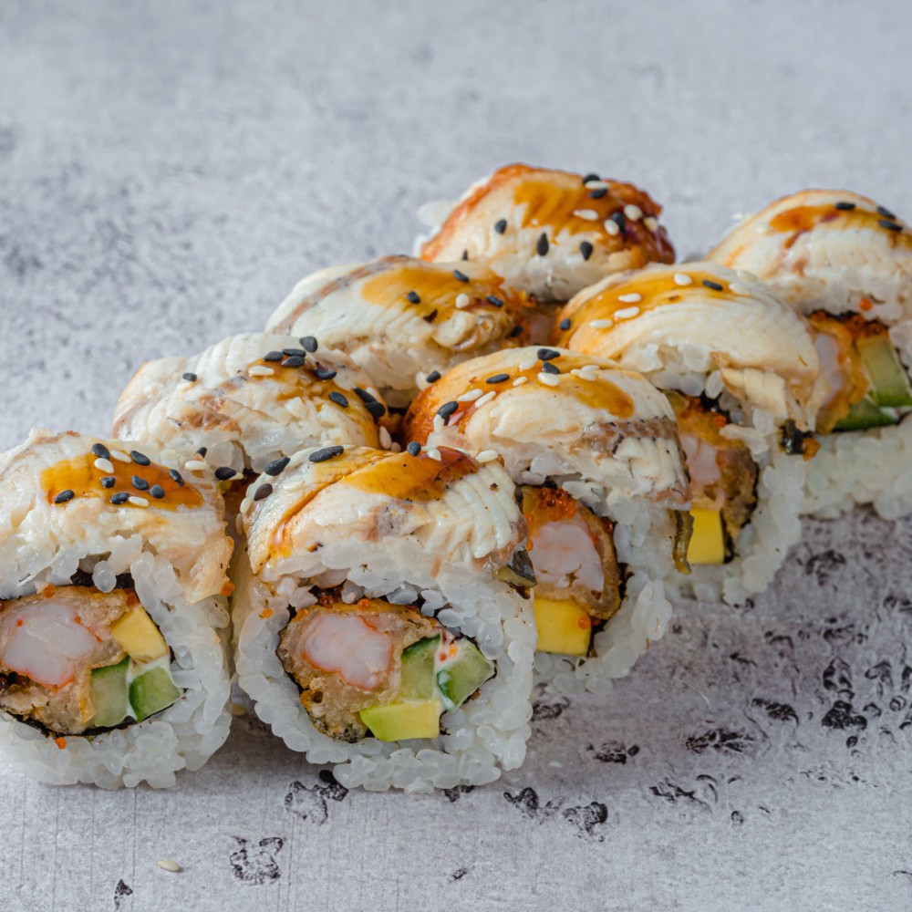 Угорь, креветки в темпуре, авокадо, огурец, тобико, японский майонез, соус терияки
