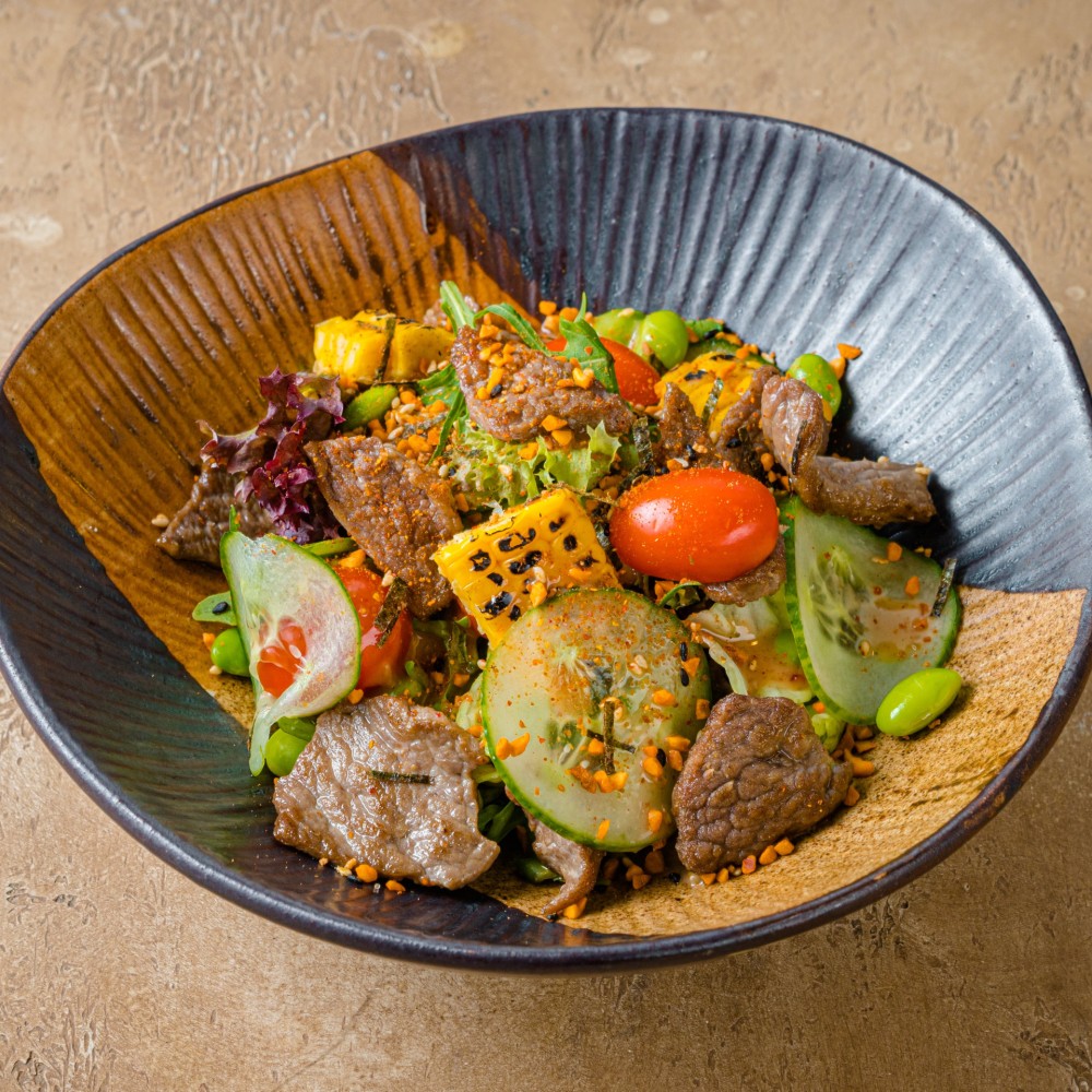 Говядина, авокадо, микс салатов, черри, огурец, бобы эдамаме, кукуруза, соус окиси