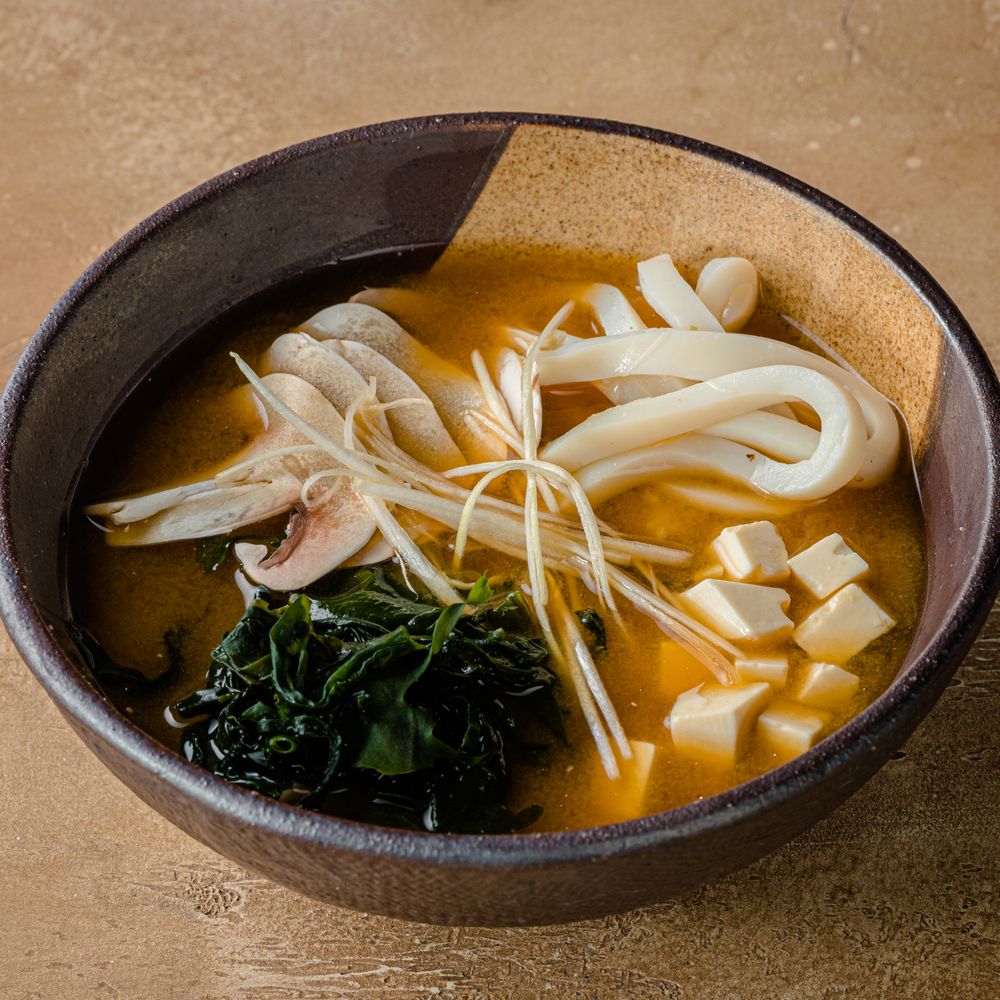 Кальмар, тофу, шампиньоны, водоросли вакаме, лук порей, соевый бульон