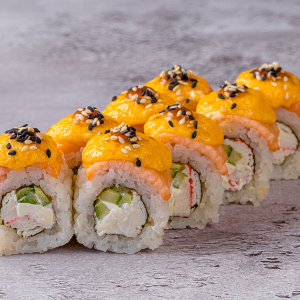 Лосось, сурими, сливочный сыр, огурец, соусы: для запекания, терияки
