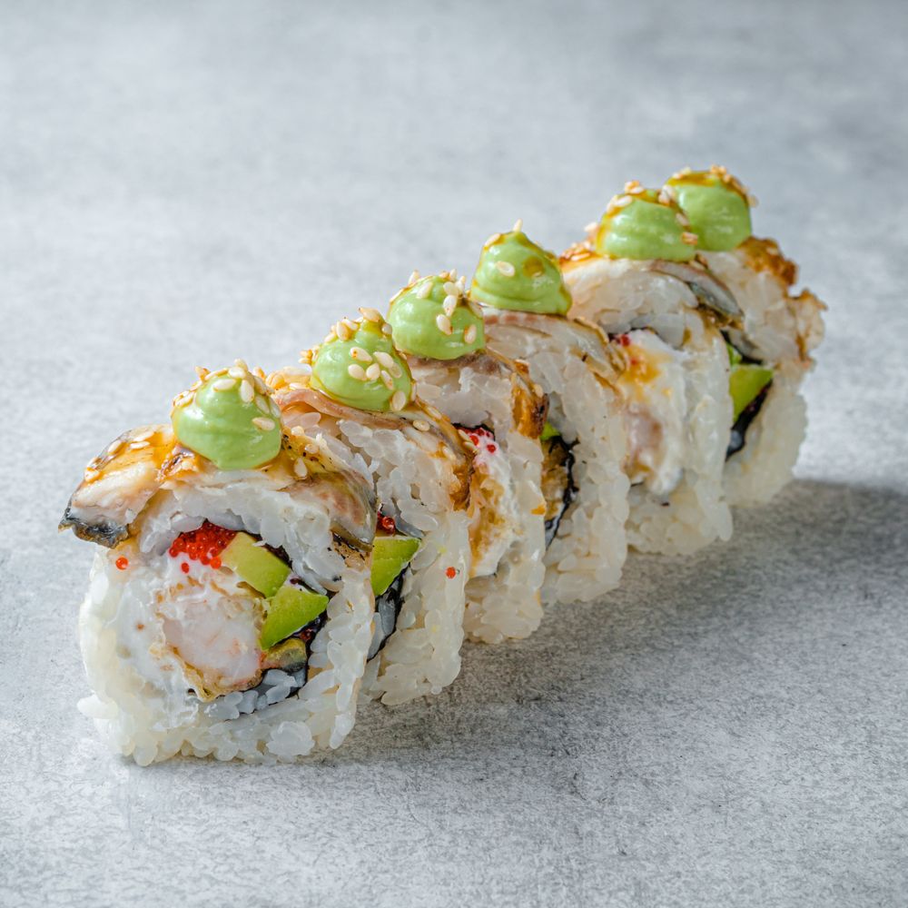 Угорь, креветки в темпуре, тобико, авокадо, сливочный сыр, яблочный мусс, соус терияки