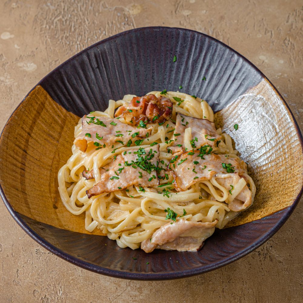 Удон с беконом в сливочно-сырном соусе