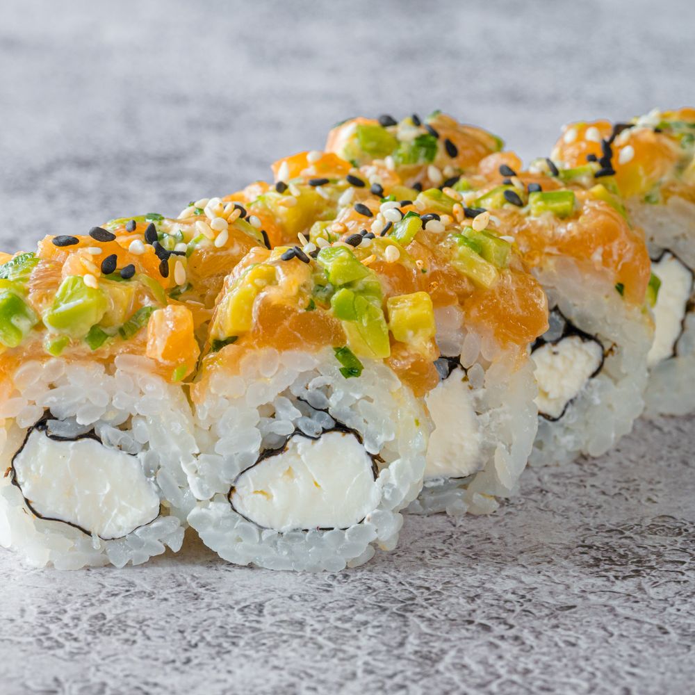 Лосось, авокадо, сливочный сыр, зеленый лук, японский майонез, соусы: устричный, терияки