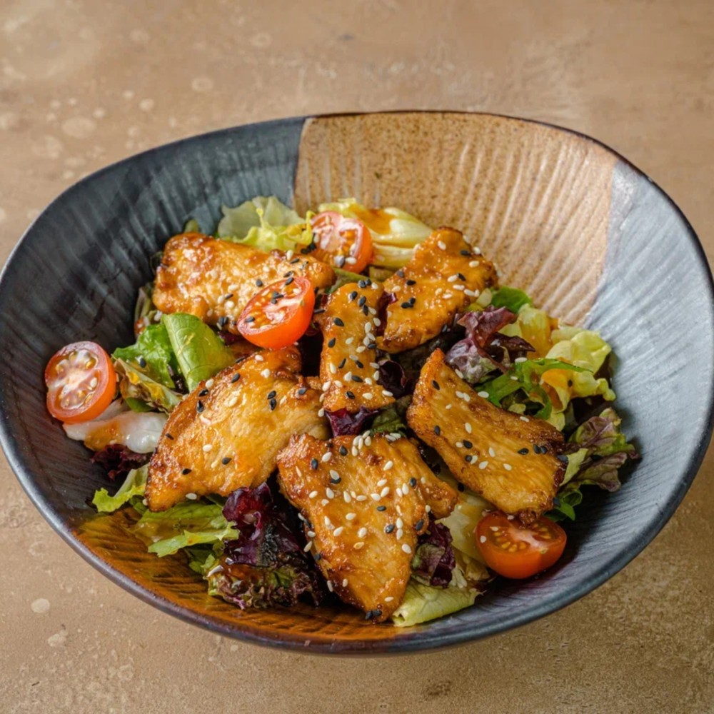 Филе куриной грудки, микс салатов, черри, кисло-сладкий чили соус