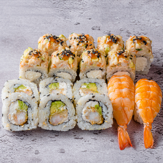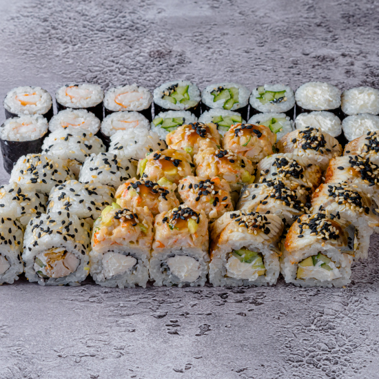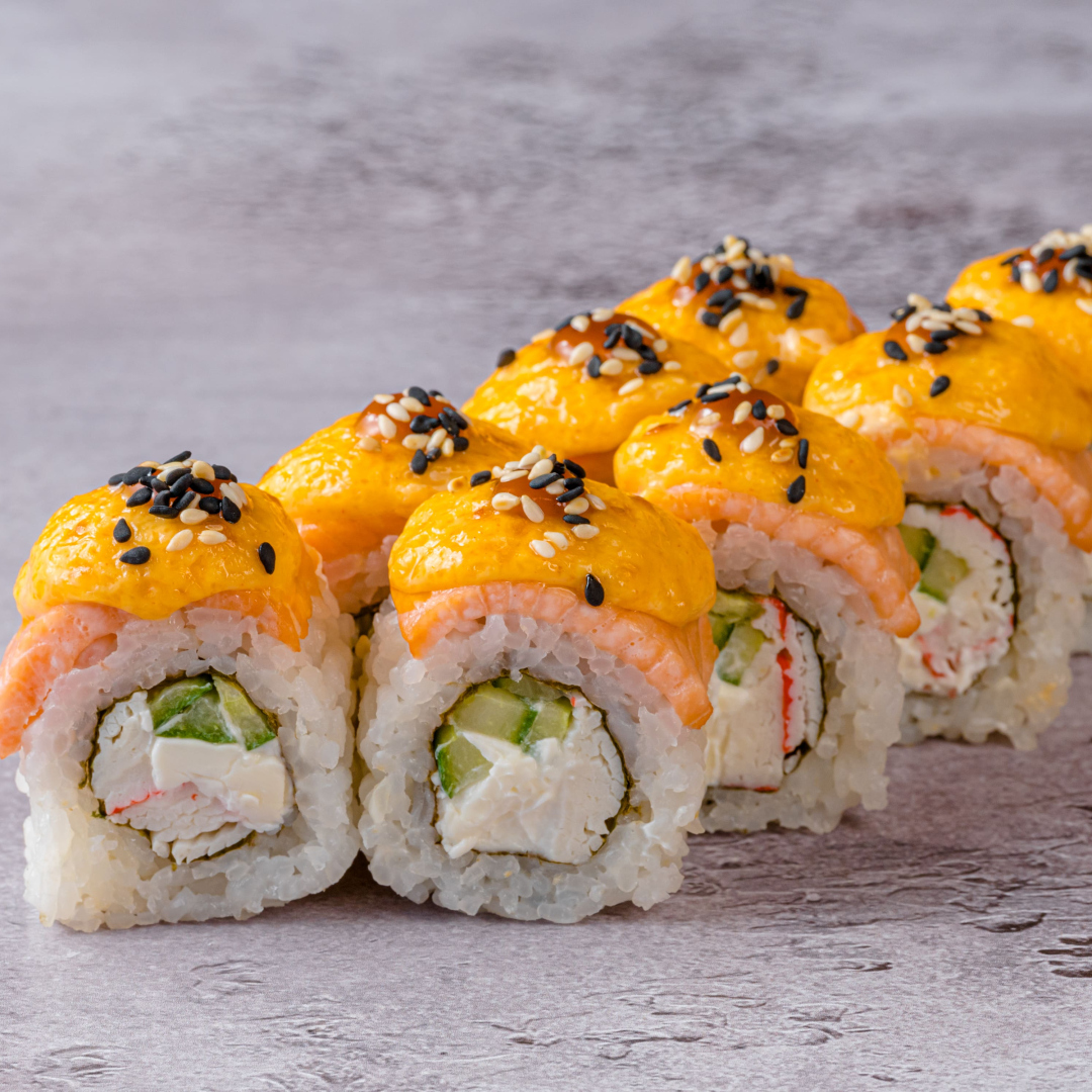 Лосось, сурими, сливочный сыр, огурец, соусы: для запекания, терияки