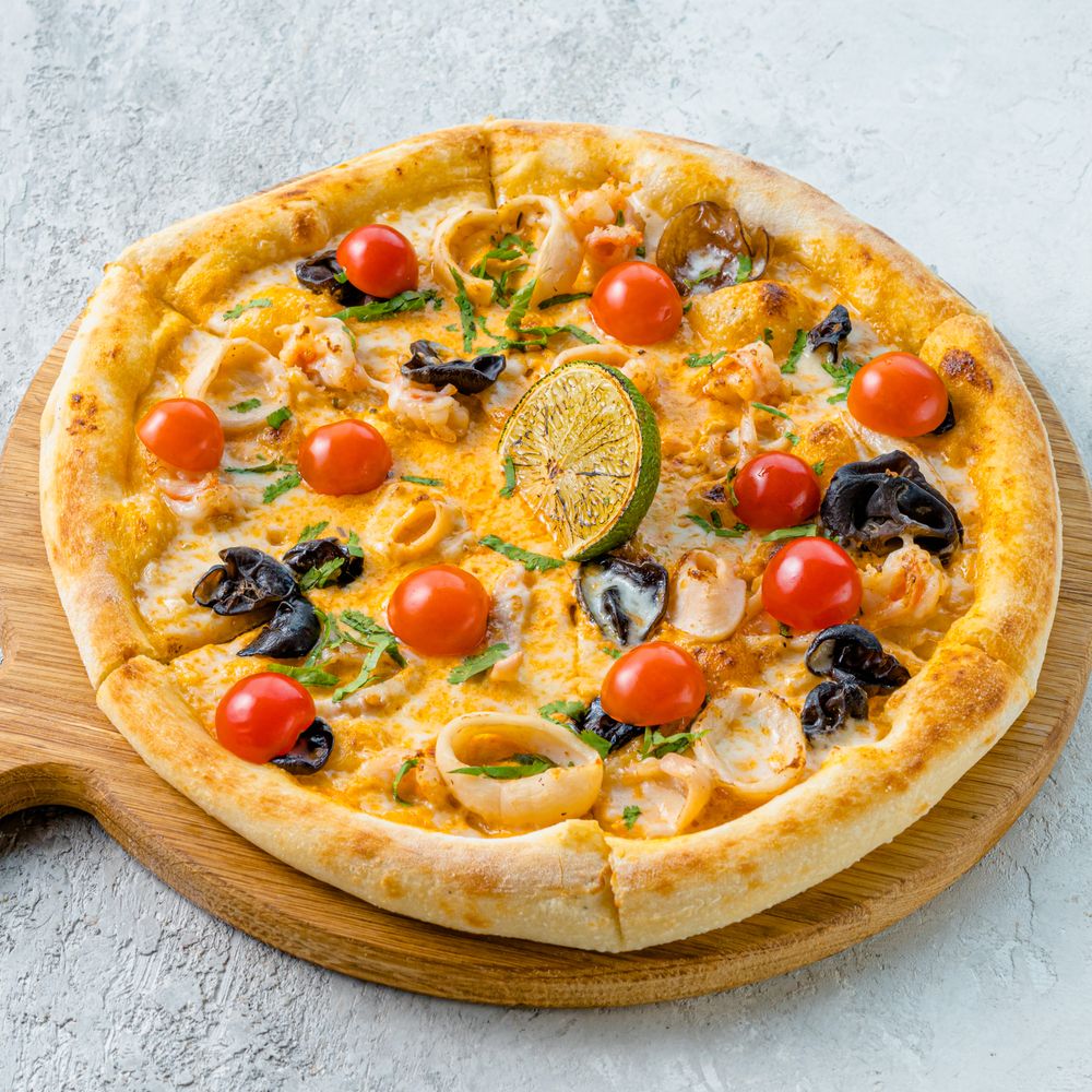 Креветки, кальмар, муэр, моцарелла, черри, кинза, соус том ям