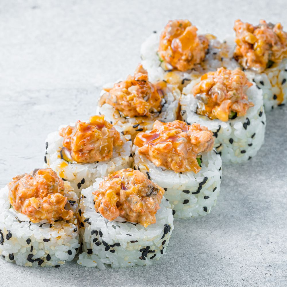 Угорь, манго, тобико, сливочный сыр, авокадо, темпурные хлопья, соусы: спайс, терияки